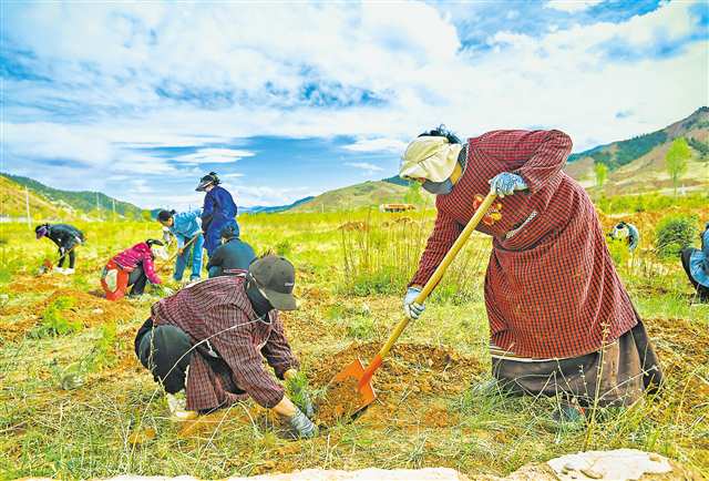6月5日,芒康县林业产业扶贫苗圃基地,当地林业工人正在栽种崖柏幼苗。记者 郑宇 谢智强摄/视觉重庆