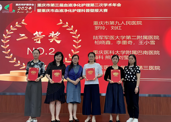 2024年6月2日,由重庆市护理学会主办,陆军军医大学西南医院承办的“重庆市第三届血液净化护理年会暨重庆市血液净化护理科普壁报大赛”落下帷幕。经过角逐,重庆医科大学附属巴南医院(重庆市巴南区人民医院)肾脏内科血液净化护理团队制作的《内瘘锻炼咋个整?一图解读教会你》科普壁报获第二名。