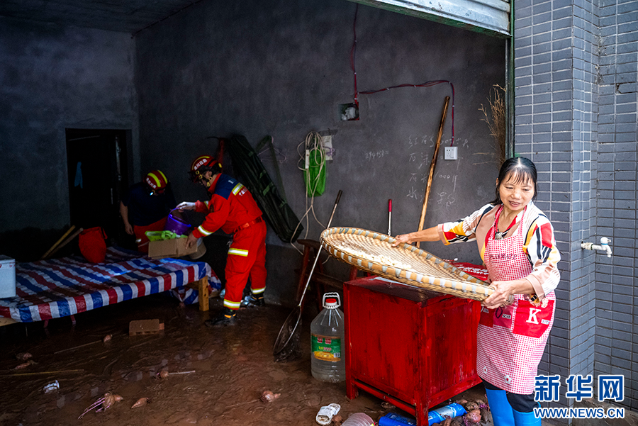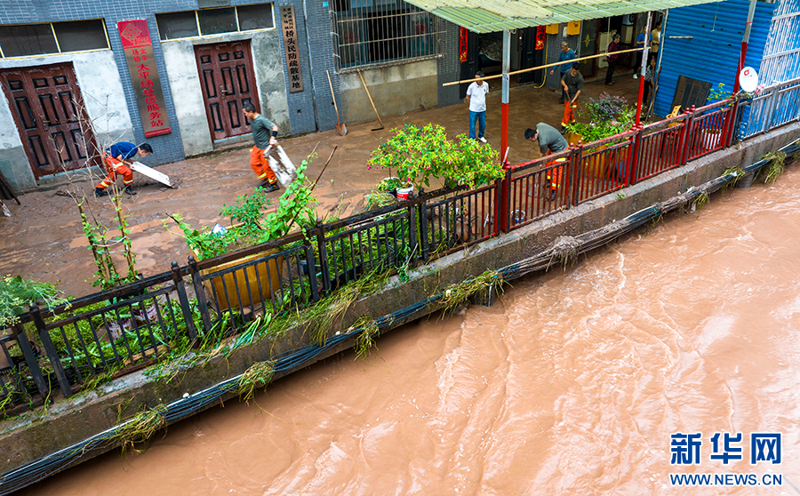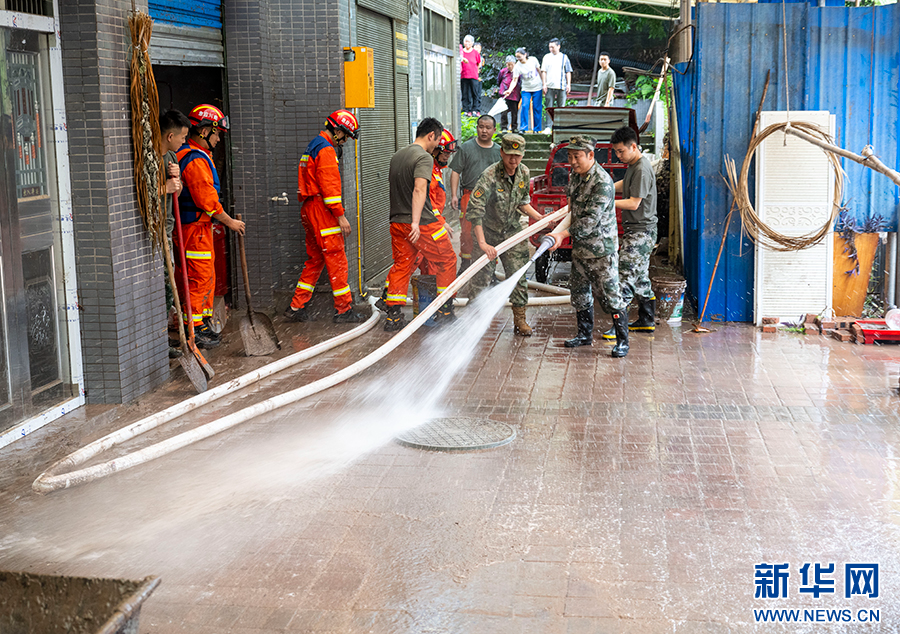 6月21日,重庆市南川区太平场镇桥头社区,应急管理局救援人员在帮助受灾群众清淤。新华网发(甘昊旻 摄)
