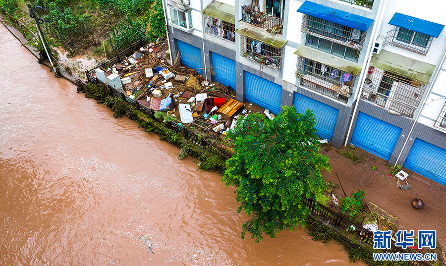 6月21日,重庆市南川区太平场镇水位上涨,河道边流水堆积的杂物。新华网发(甘昊旻 摄)