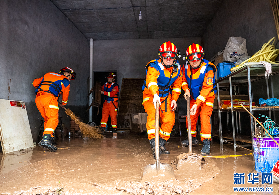6月21日,重庆市南川区应急管理局救援人员在帮助受灾群众清淤。新华网发(甘昊旻 摄)