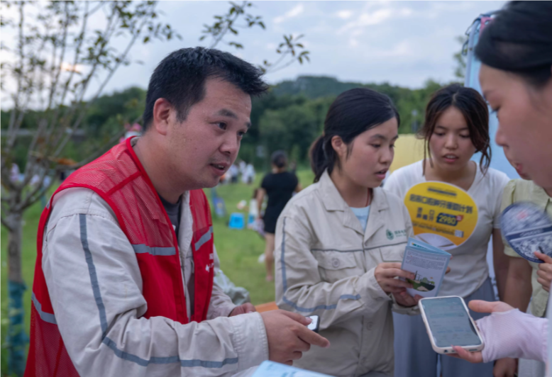 活动现场气氛热烈,人们纷纷走出空调房,沉浸在音乐、啤酒、美食、美景中,感受夏日激情畅快。为积极响应国网重庆市电力公司“离开空调房2小时,你在做什么?”热门话题,该公司荣昌供电中心工作人员耐心地向“离开空调房”市民和游客发放宣传单,引导下载“网上国网”App,详细讲解“e起节电”活动的参与方式及节能小技巧。