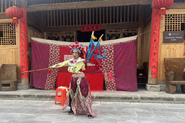 活动期间,传承团成员在兴隆村观看了阳戏经典曲目《三打柳州》,并与阳戏传承人、表演者冷定祥进行了现场访谈。“从唐朝到现在,阳戏代代相传。为了符合当代文化审美与潮流,我们不断改进曲目来吸引更多年轻人的兴趣。”冷定祥抚摸着戏服感慨道,当地人祖祖辈辈听阳戏、学阳戏、唱阳戏。