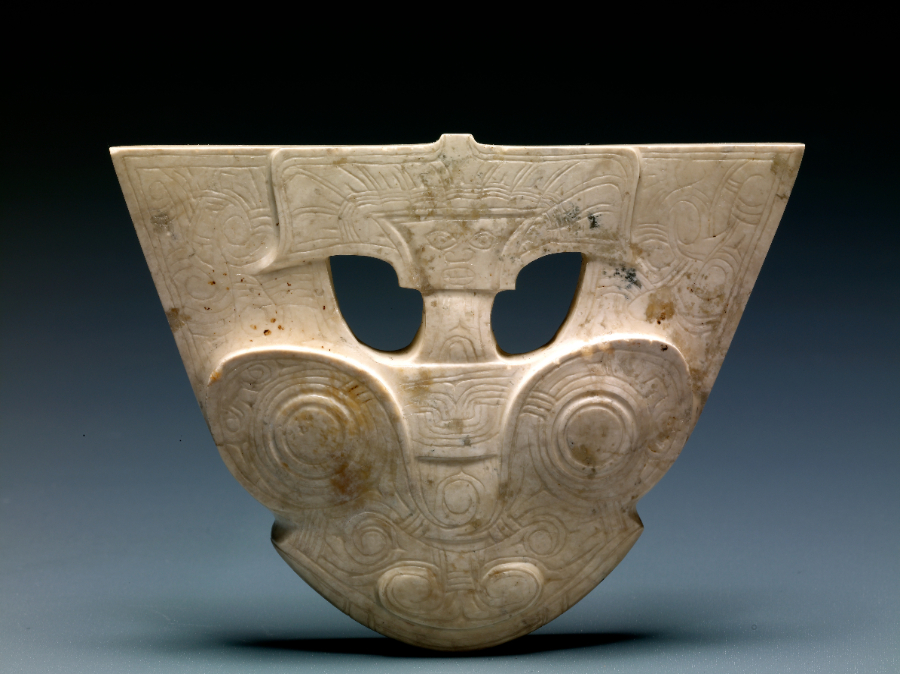 图为本次展出的重点文物:良渚文化神人兽面纹玉牌饰,该文物为浙江省博物馆藏。