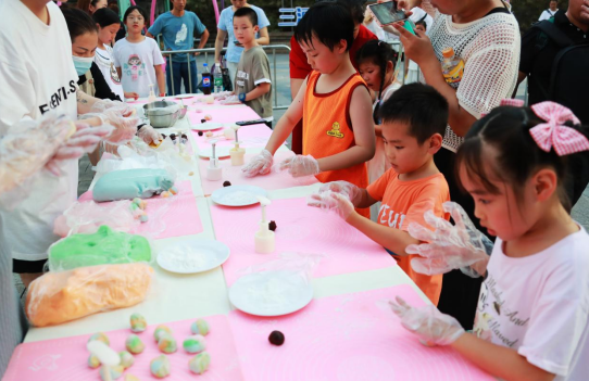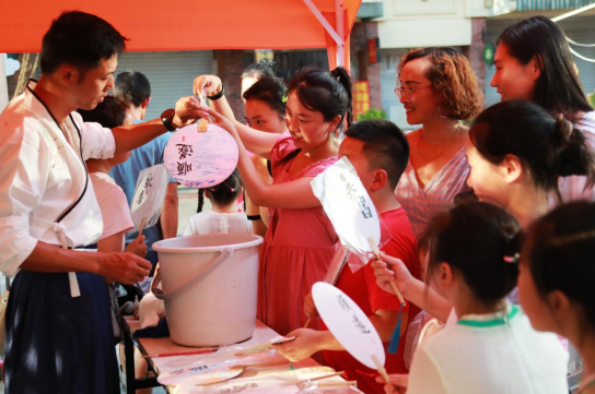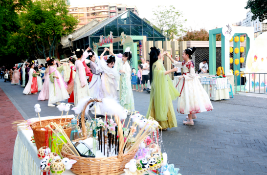 现场,市民游客来到三河汇碧文创街区领略中国传统文化、选购非遗商品,在趣味蹴鞠、“玉兔吃月饼”、“后羿射日”、猜灯谜、DIY月饼、漆扇等活动中感受中秋佳节浓厚的节日氛围。一场汇聚嫦娥演艺、汉服快闪、歌舞、沉浸式街区演艺等形式的中秋汉服巡游创意快闪也同步在街区上演,百余名汉服爱好者们在街区开展即兴表演,吸引数千市民游客沉浸式感受,成为一道亮丽的风景。