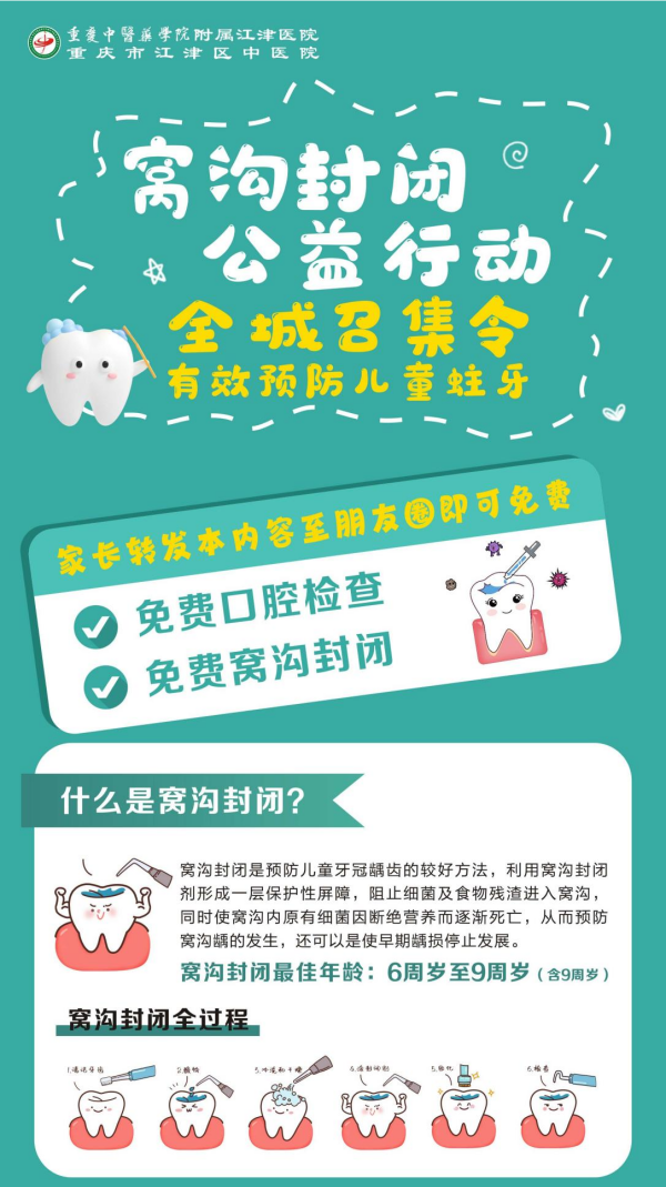 日前,重庆中医药学院附属江津医院(江津区中医院)开展窝沟封闭公益行动,家长转发至朋友圈即可免费领取口腔检查、窝沟封闭。