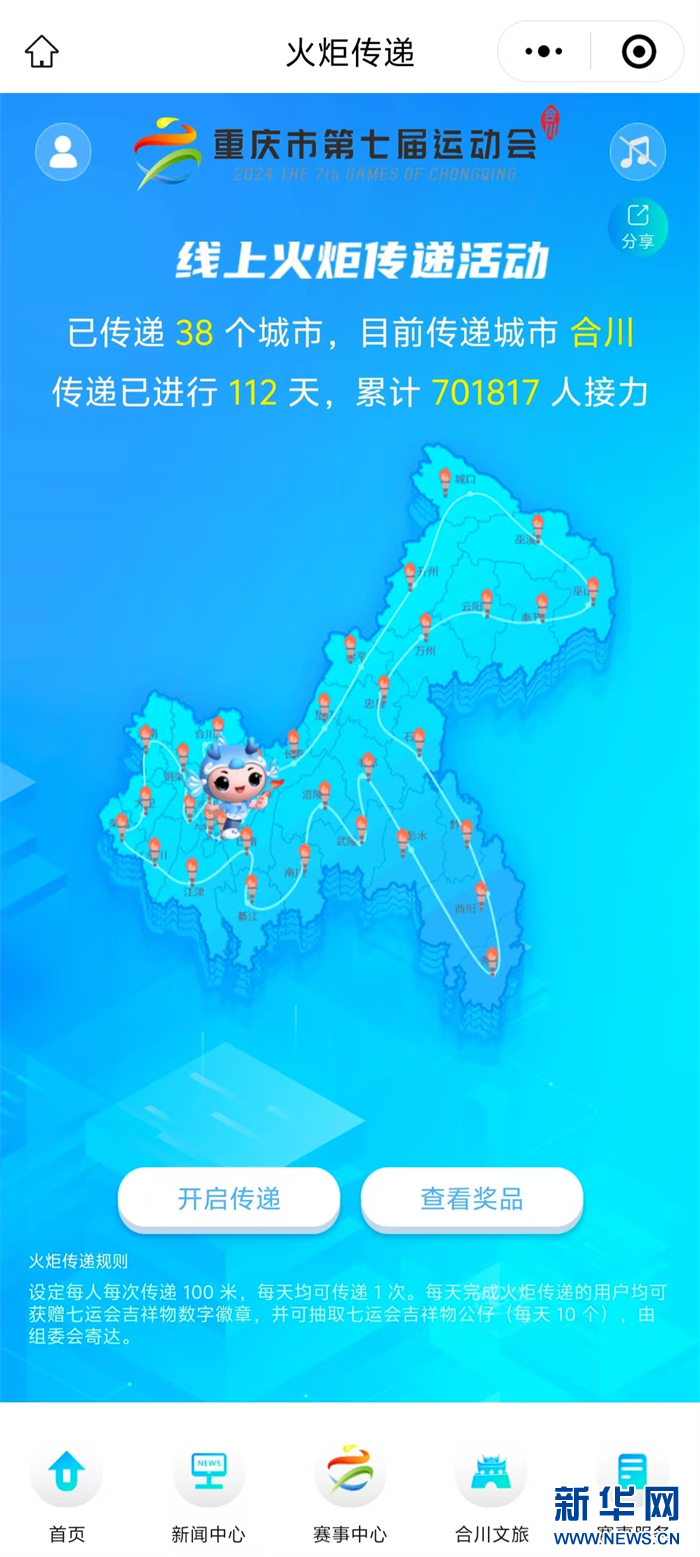 例如,市七运会的火炬传递还开设了线上传递模式,只需进入“重庆市七运会”官网或小程序,首页首屏即可点击参与,还可抽奖获得市七运会的吉祥物这些礼品。