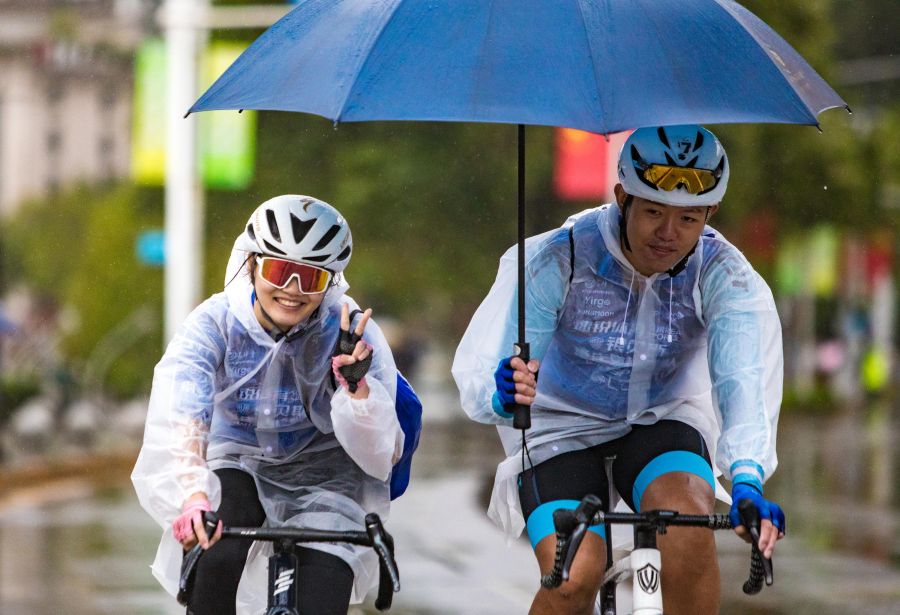万州区移民广场,自行车选手撑伞骑行。(侯本艳 摄)