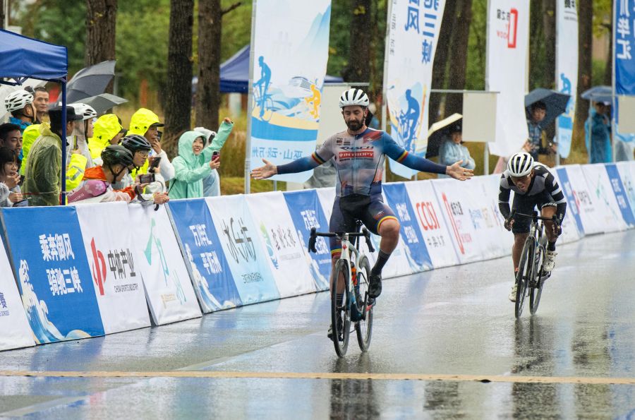 万州区北滨大道,自行车选手夺冠瞬间。(冉孟军 摄)
