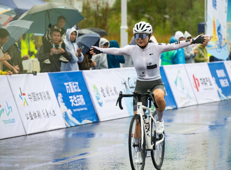 万州区北滨大道一段,完成比赛的女选手振臂高呼。(冉孟军 摄)
