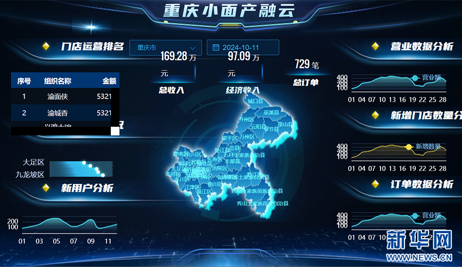 图为“重庆小面产融云”平台数智大脑显示屏上,实时更新的重庆小面产业数据。新华网 发