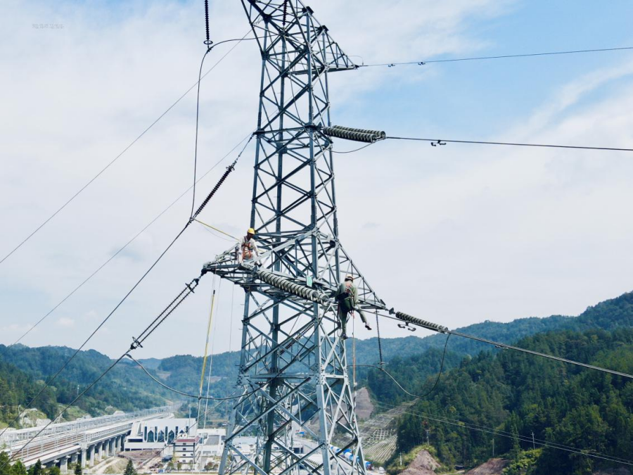 10月7日,国网重庆石柱供电公司员工正在对高铁站旁的220千伏宾沙北线进行检修消缺,全力保障电网安全。(王紫晗 摄)