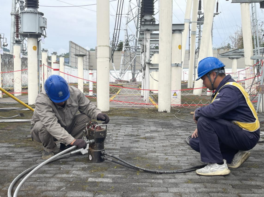 10月16日,国网重庆秀山供电公司员工在220千伏秀山变电站压接设备线夹。(万雪莲 摄)