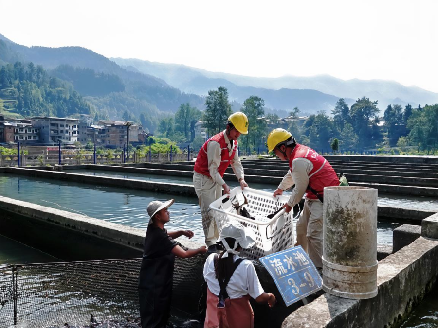 10月12日,国家电网(石柱)红岩共产党员服务队队员正在检查马武镇鱼龙渔场用电安全可靠,同时帮助渔民捕鱼。(王紫晗 摄)