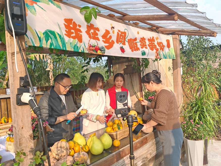 民宿院子专门辟出一角,搭建了一个“土味”十足的直播间,把村子里的土鸡土鸭、新鲜水果等土特产推销到重庆甚至全国各地。