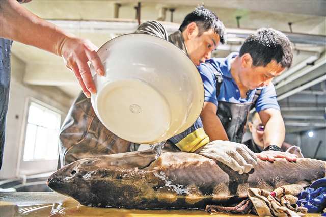 万州区水产研究所双河口基地,为让“生产”中的长江鲟保持呼吸顺畅,工作人员不停向鱼鳃浇水。记者 谢智强 摄/视觉重庆