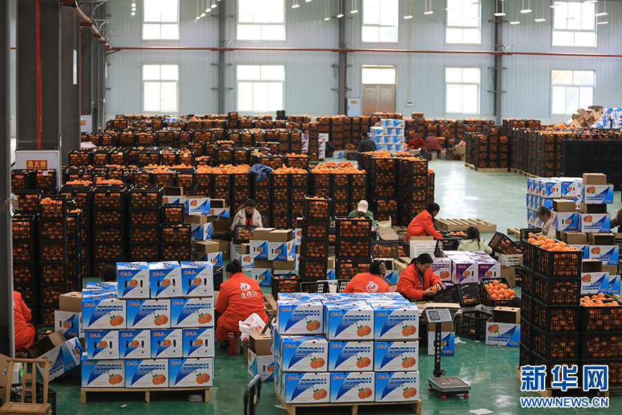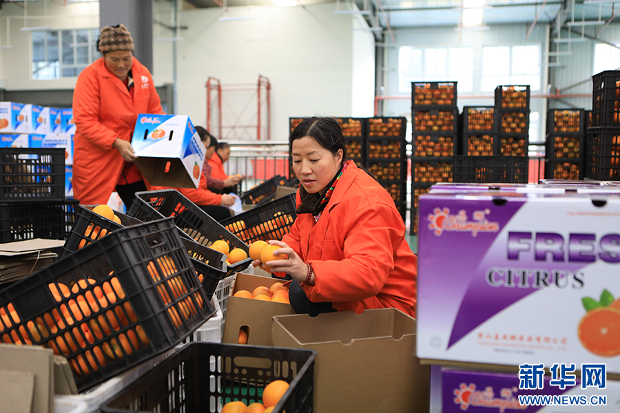 果农们正在将脐橙打包装箱。新华网发(胡程 摄)