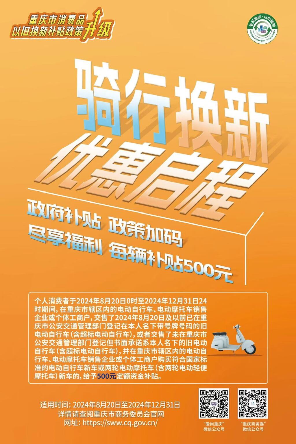 8月20日,重庆市商务委员会等6部门印发关于《推进实施2024年电动自行车以旧换新补贴政策的通知》(渝商务〔2024〕226号),对符合条件的个人消费者交售本人名下的旧电动自行车并购买符合国家标准的电动自行车新车的,给予500元/辆定额资金补贴。