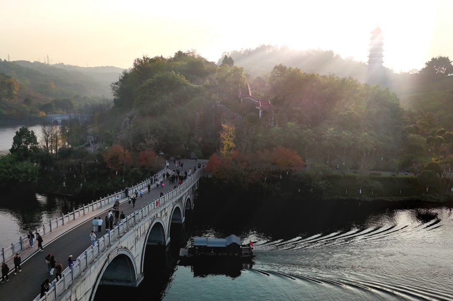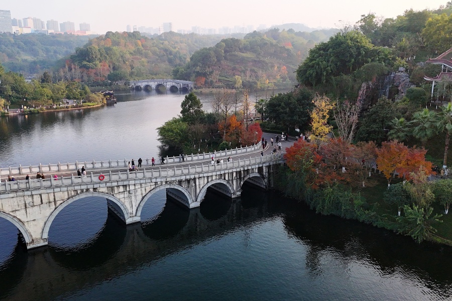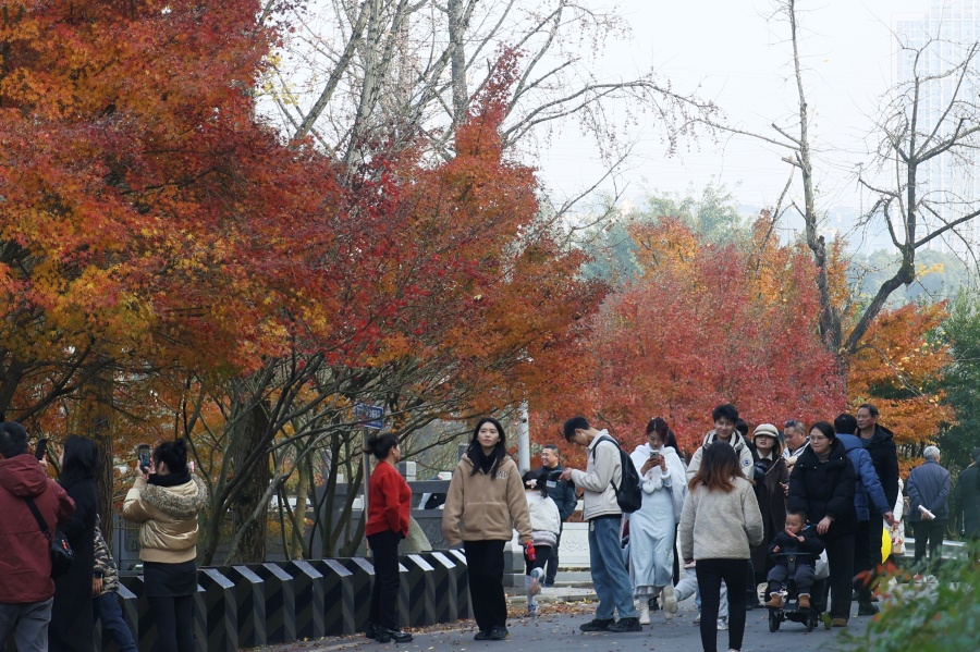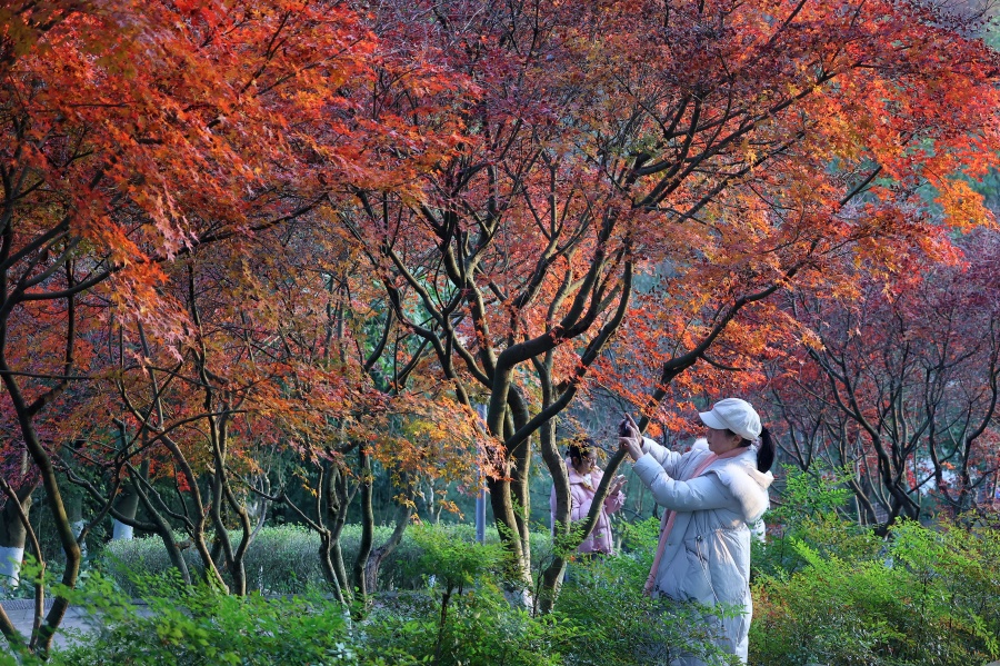 近日,重庆园博园“枫”景如画。阳光下,环湖沿线及现代园、巴渝园、江南园等展园内皆可见红枫的曼妙身姿,景区巧妙地将山体与色叶植物相结合,引得游客纷纷拍照“打卡”,记录层林尽染的浪漫“枫”景。