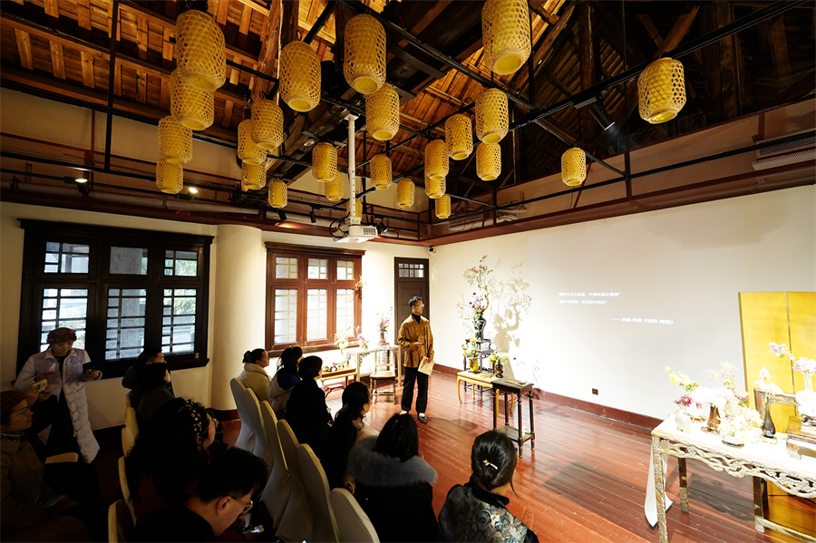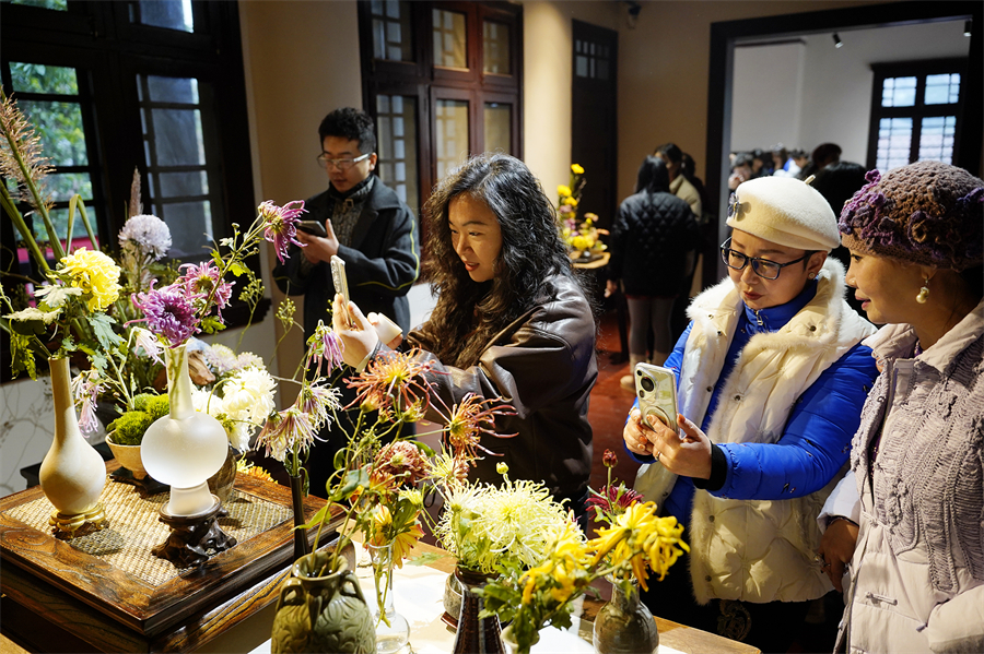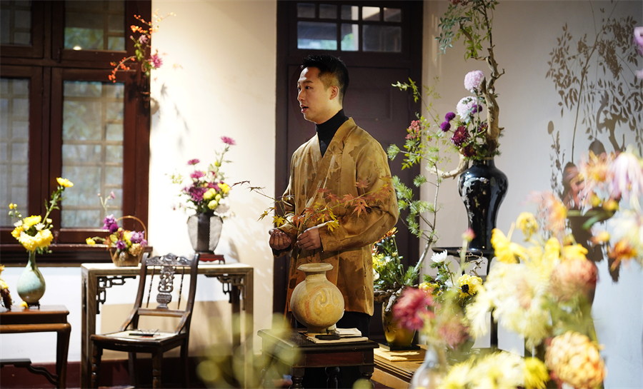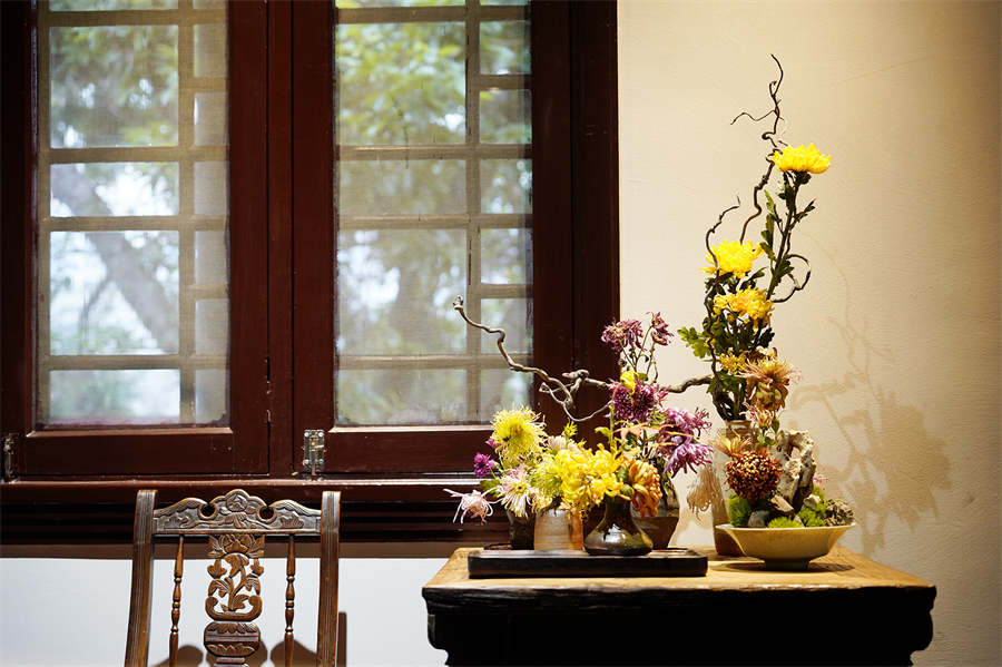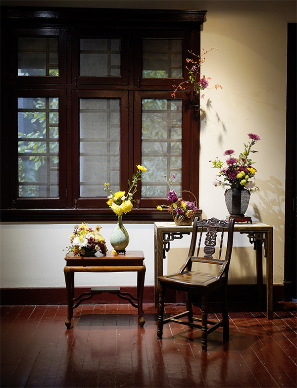活动中的菊花插花作品与公馆环境相得益彰,让人深感雅意。(彭博 摄)