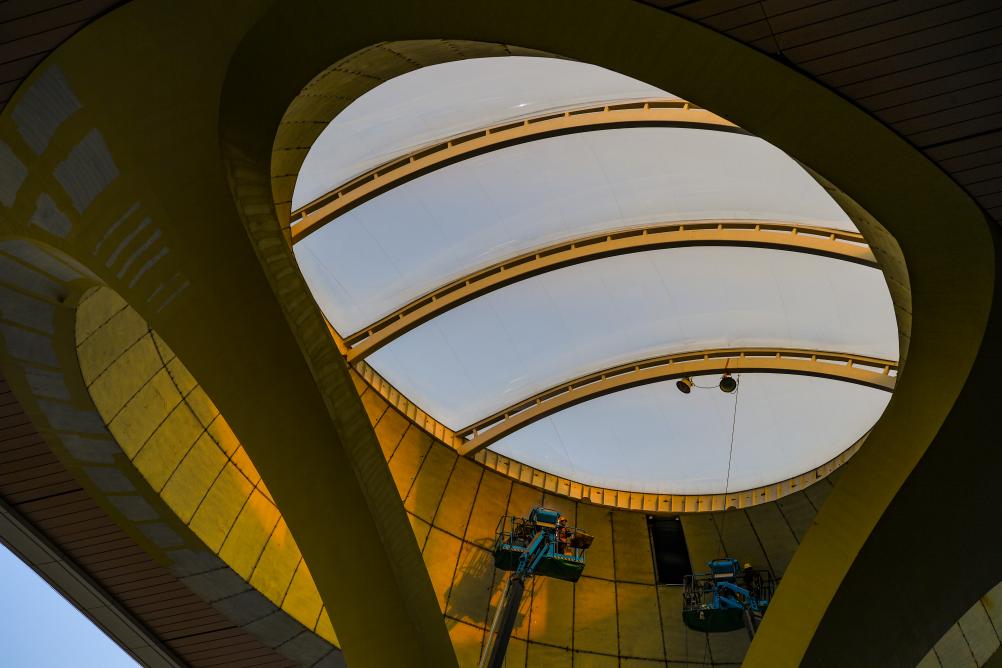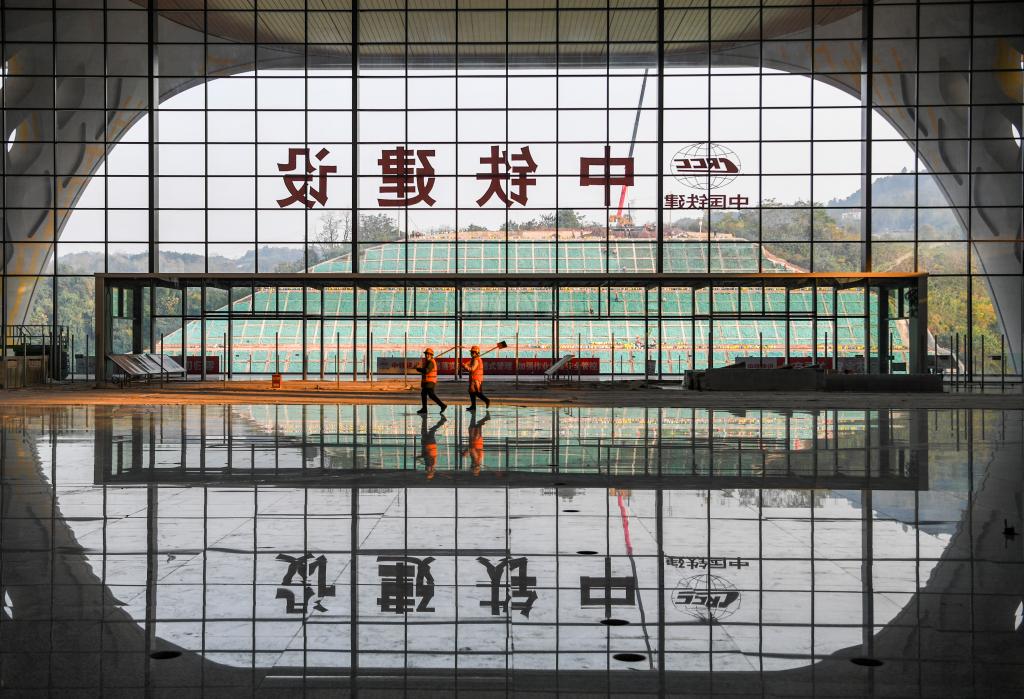 12月23日,中铁建设工人在重庆东站站房及配套综合交通枢纽工程项目作业。