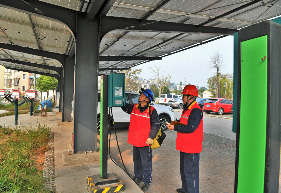 国网重庆市北供电公司石兴供电所员工检查金刚村光伏充电长廊的充电桩。(冯胜岚 摄)