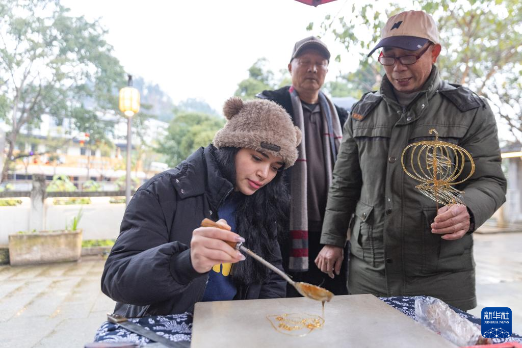 1月7日,在重庆市北碚区偏岩古镇,留学生体验糖画制作。新华社记者 黄伟 摄