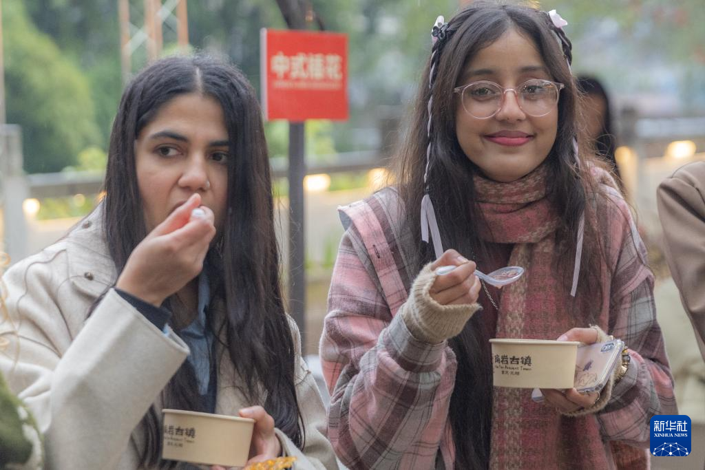 1月7日,在重庆市北碚区偏岩古镇,留学生品尝腊八粥。新华社记者 黄伟 摄