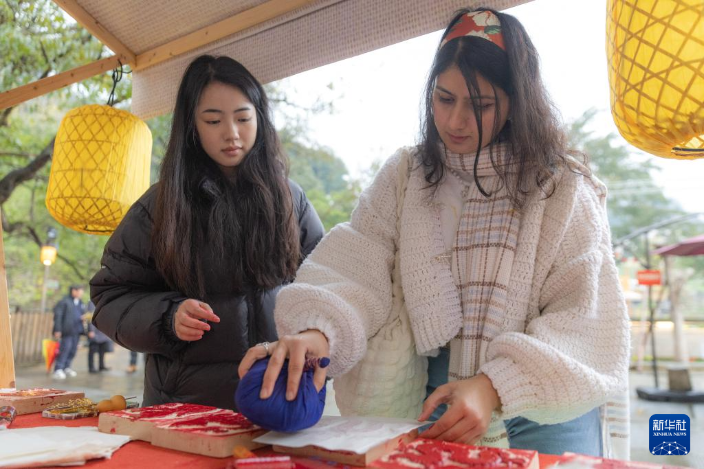 1月7日,在重庆市北碚区偏岩古镇,留学生体验传统拓印。新华社记者 黄伟 摄