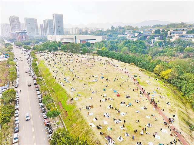 1月11日,南岸区广福大道水体湿地公园,众多市民在草坪露营玩耍。
