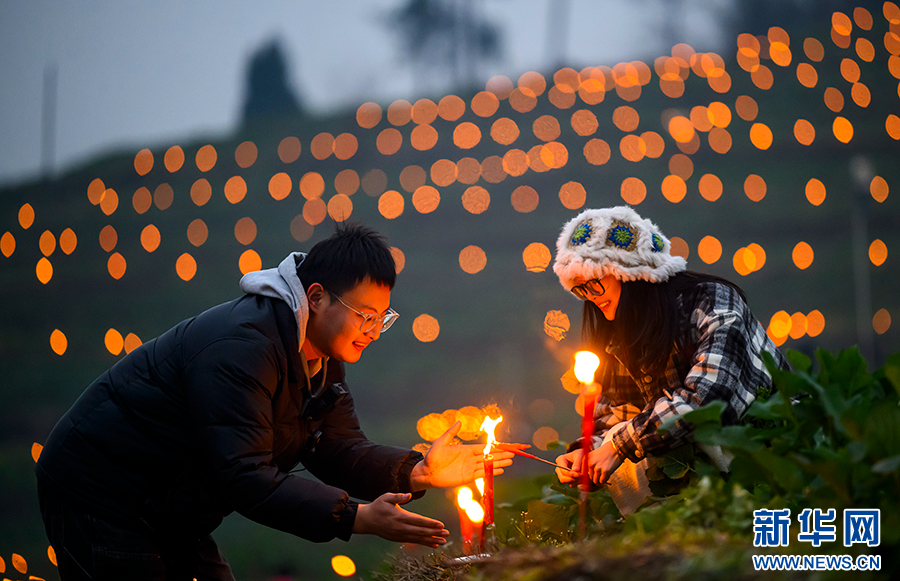在夜色的衬托下,光红烛亮,显得格外光彩夺目,幸福的笑容洋溢在人们脸上。新华网发(甘昊旻 摄)