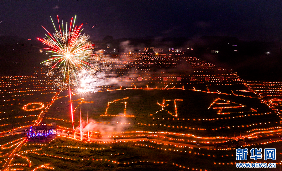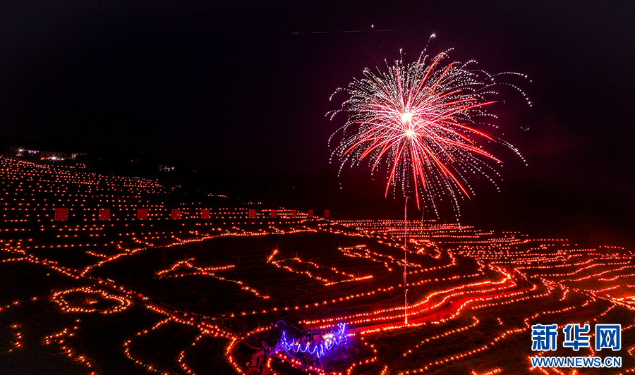烟花升空时,梯田化作星海,篝火晚会与民俗表演更添热闹。新华网发(甘昊旻 摄)