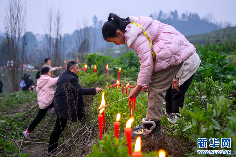 村民沿着房檐、路边、田埂点燃蜡烛,一根根摆放连接成灯的长龙。新华网发(甘昊旻 摄)