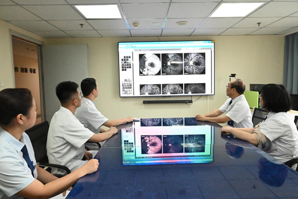 面对复杂病情,爱尔眼科重庆特区副总院长王一带领眼底科团队探讨手术方案。考虑到常规玻璃体切割术对秦先生病情效果不佳,团队最终决定采用难度较大的左眼视网膜下注药术。