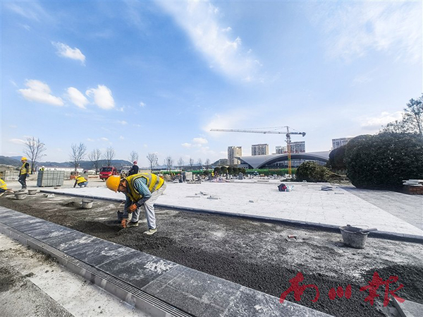 3月19日,20多名工人忙着在渝厦高铁南川北站站前广场绿化带内栽树补绿,另一边,工人正在铺设地砖。