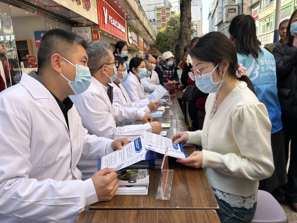在彭水县城十字街广场,医务人员通过悬挂宣传横幅、张贴宣传海报、发放宣传物品,发放宣传单,提供结核病防治健康咨询服务,宣传结核病诊断标准、治疗方案和保障政策,引导社会大众树立个人是健康“第一责任人”的意识,养成多通风、不随地吐痰等良好卫生习惯。出现咳嗽、咳痰两周以上等结核病可疑症状应佩戴口罩、及时就诊。同时,为过往群众免费提供血压测量、血糖测试。