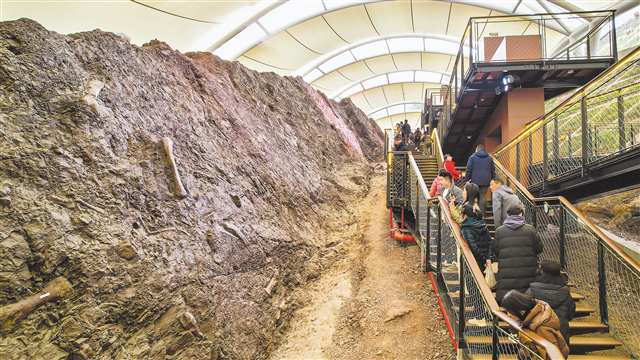 游客在云阳世界地质公园参观恐龙化石墙(1月30日摄,无人机照片)。新华社发