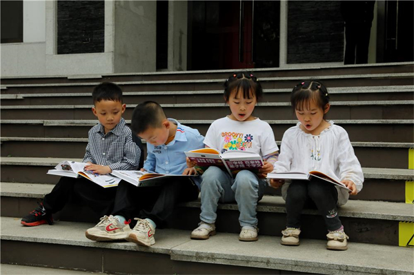 4月19日,梁平影剧院广场,小朋友们拿着从现场书展选好的图书,坐在台阶上认真阅读。
