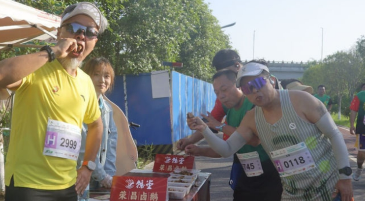 值得一提的是,赛事创新融入了荣昌卤鹅元素,让奔跑与美食文化体验相得益彰。比如,完赛奖牌设计独具匠心,正面是栩栩如生的卤鹅形象,身上巧妙地融入了荣昌非遗之一的折扇元素,下方还刻画着荣昌三大地标景点——万灵小镇、安陶小镇以及夏布小镇。参赛服也别具一格,正面印有卤鹅哥林江的卡通形象,极具辨识度。此外,参赛包、完赛包、完赛浴巾等,都巧妙地融入了卤鹅的文化元素。赛场现场提供了卤鹅等丰富多样的美食补给,让跑者在比赛过程中,既能享受运动的快乐,又能品尝到荣昌的地道美食,充分感受这座城市的独特风味。