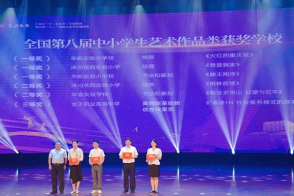 全国第八届中小学学生艺术作品获奖学校颁奖现场。