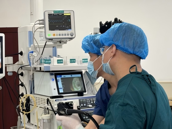 摆在医生面前的是三重难关:患者胃部解剖结构因手术完全改变,犹如“迷宫”;大量腹水让肠管像“漂浮的树叶”难以定位;最棘手的是,由于肺部严重积水,常规麻醉风险高,手术必须在患者清醒状态下进行。“手术要求高,任何一个失误都可能导致穿孔、大出血等致命后果。”为此,何松协同肿瘤科、消化内科、麻醉科、内分泌科、营养科等开展多学科会诊评估,讨论可行的治疗方案,最终团队决定由消化内科副主任宁波、消化内镜中心护士长吴素华及甯鑫鑫采用创新的“两步走”方案。