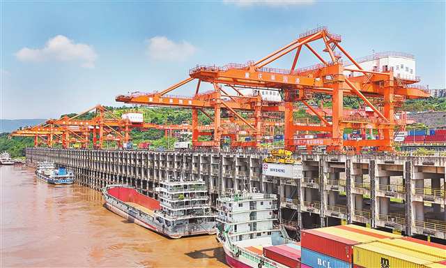 八月十九日,重庆果园港,岸桥起落之间,一个个集装箱被平稳码放到货船上。记者 张锦辉 摄\视觉重庆