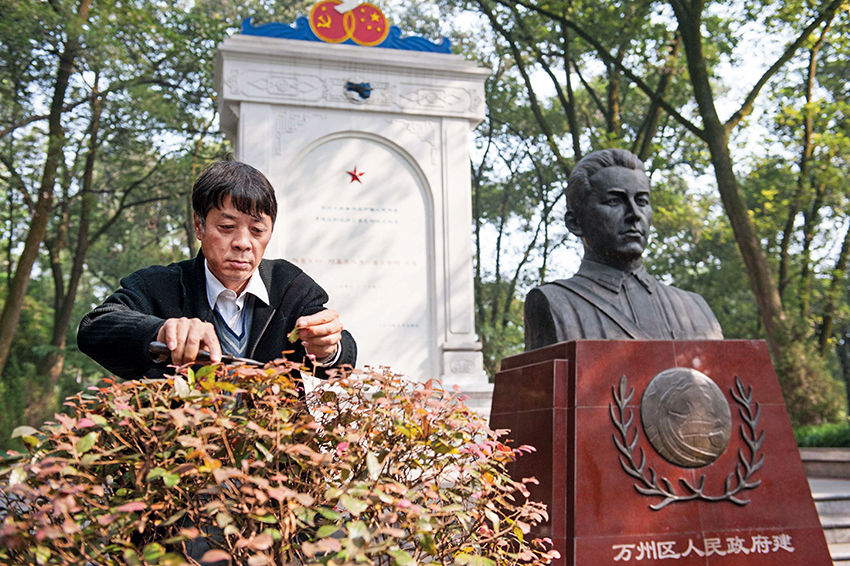 图为魏映祥在库里申科烈士雕像前修剪陵园内的苗木。