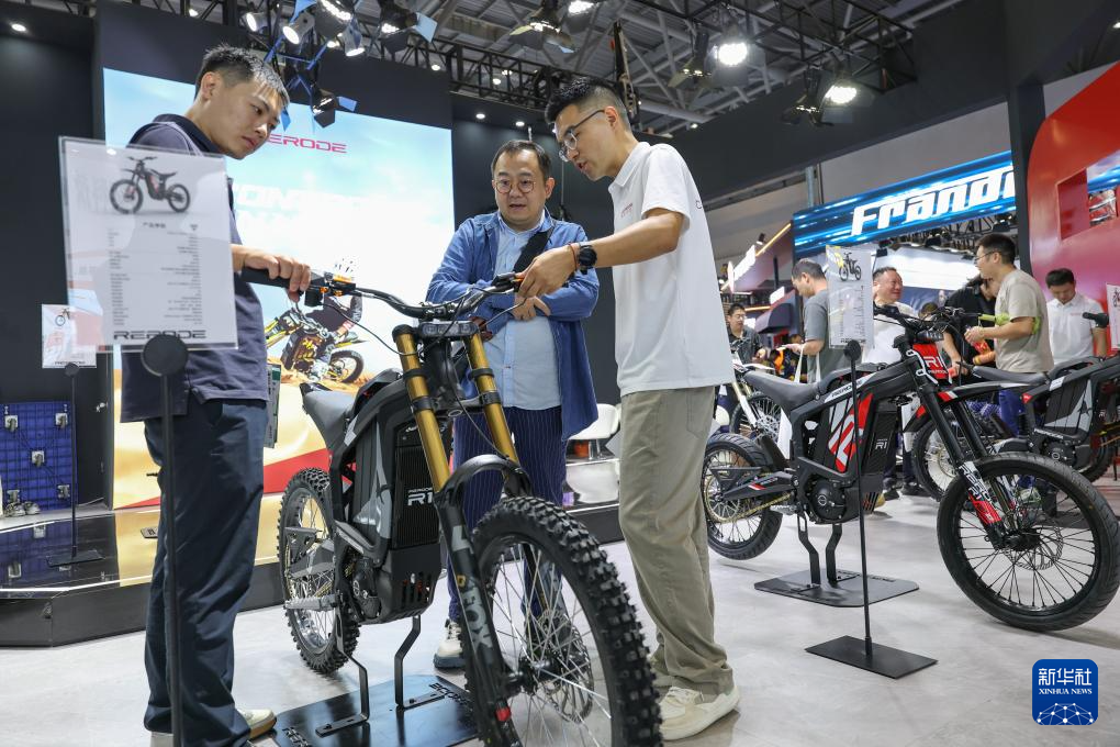 第23届中国摩博会上,观众在现场询问国产新能源摩托车性能数据。新华社记者 陈诚 摄