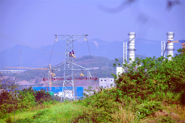 施工人员正在架设大唐江津燃机送出线路。(王化全 摄)