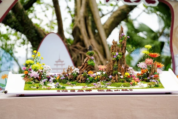 活动现场,插花作品“福菊致祥 缀美山城”惊艳亮相,以“菊与中秋”为主题,讲述从唐代赏菊宴饮到明清“菊花插满头”的节日习俗演变,以及菊花为何成为中秋“团圆花”的文化密码。