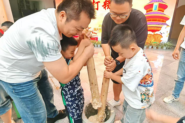 传统民俗体验区更是热闹非凡。家长和孩子们齐心协力捶打糍粑,“咚咚”的敲击声此起彼伏,奏响了一曲亲子协作的欢乐乐章;在磨黄豆粉的体验中,细腻的粉末飘散出生活的香甜,感受传统文化在指尖流转。