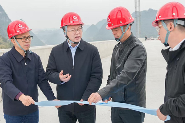 重庆交通大学1990级桥梁工程专业校友,贵州交通建设集团有限公司副总经理、总工程师韩洪举(左二)和团队共研创新技术落地方案。