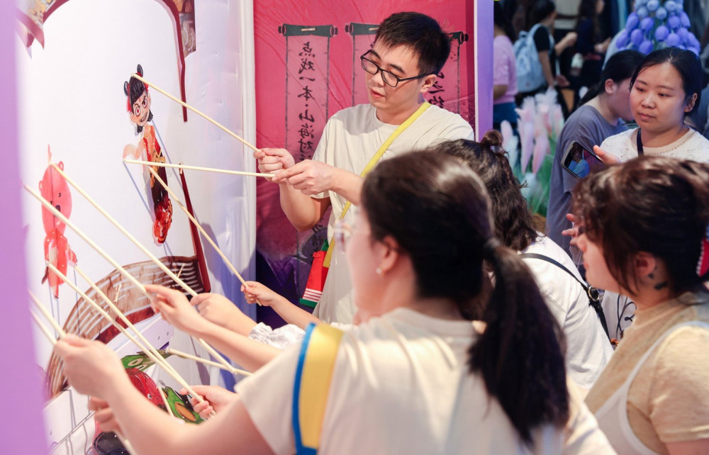观音桥大融城举办“浮游山海”非遗季活动,市民现场体验皮影戏。受访单位供图