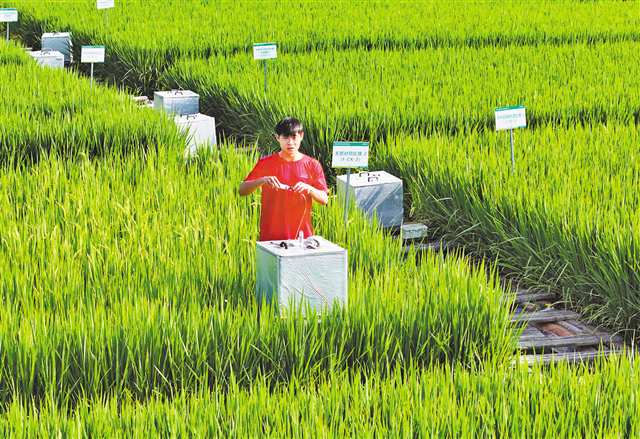 梁平区安胜镇龙印村的水稻试验田,西南大学技术人员在用静态箱采集温室气体。(资料图片)特约摄影 刘辉\视觉重庆